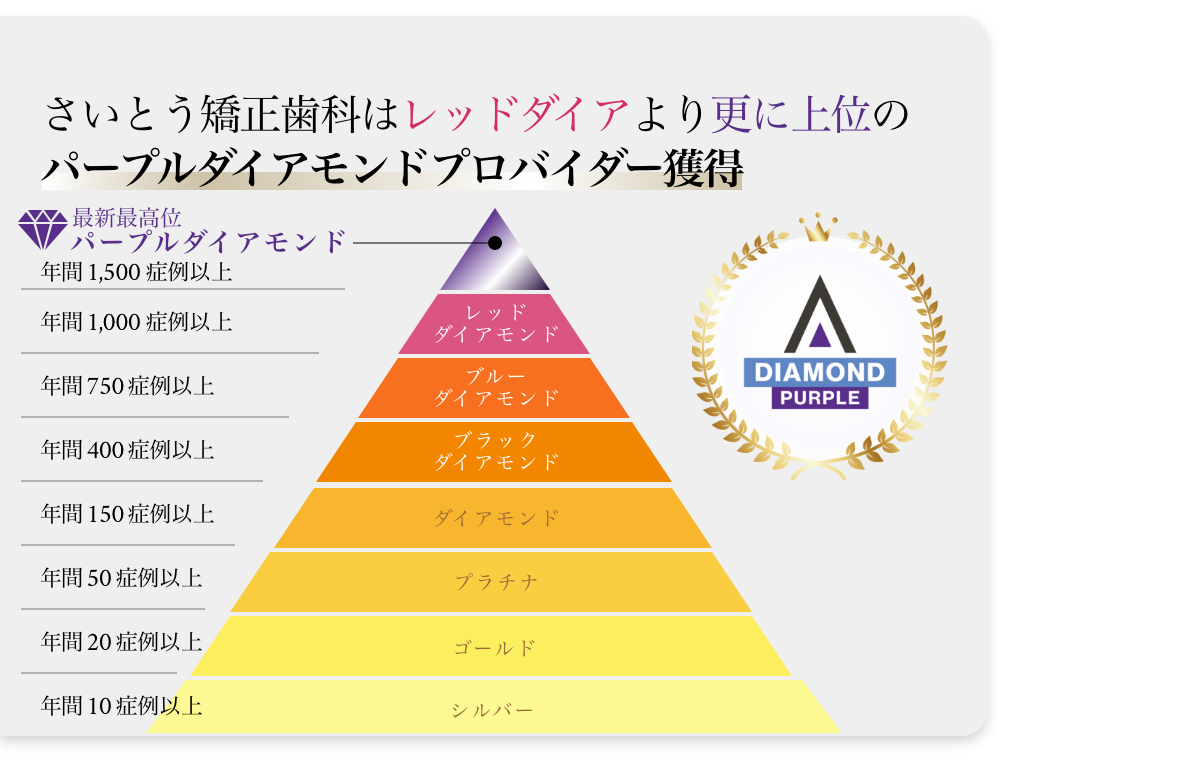 当院ではインビザラインの治療経験が豊富な「インビザラインレッドダイヤモンドプロバイダー(2019年、2020年、2021年、2022年、2023年、2024年、日本有数症例数)」認定医が治療を担当しますので、全ての患者さまの歯並びをマウスピース矯正で治すことが可能です。