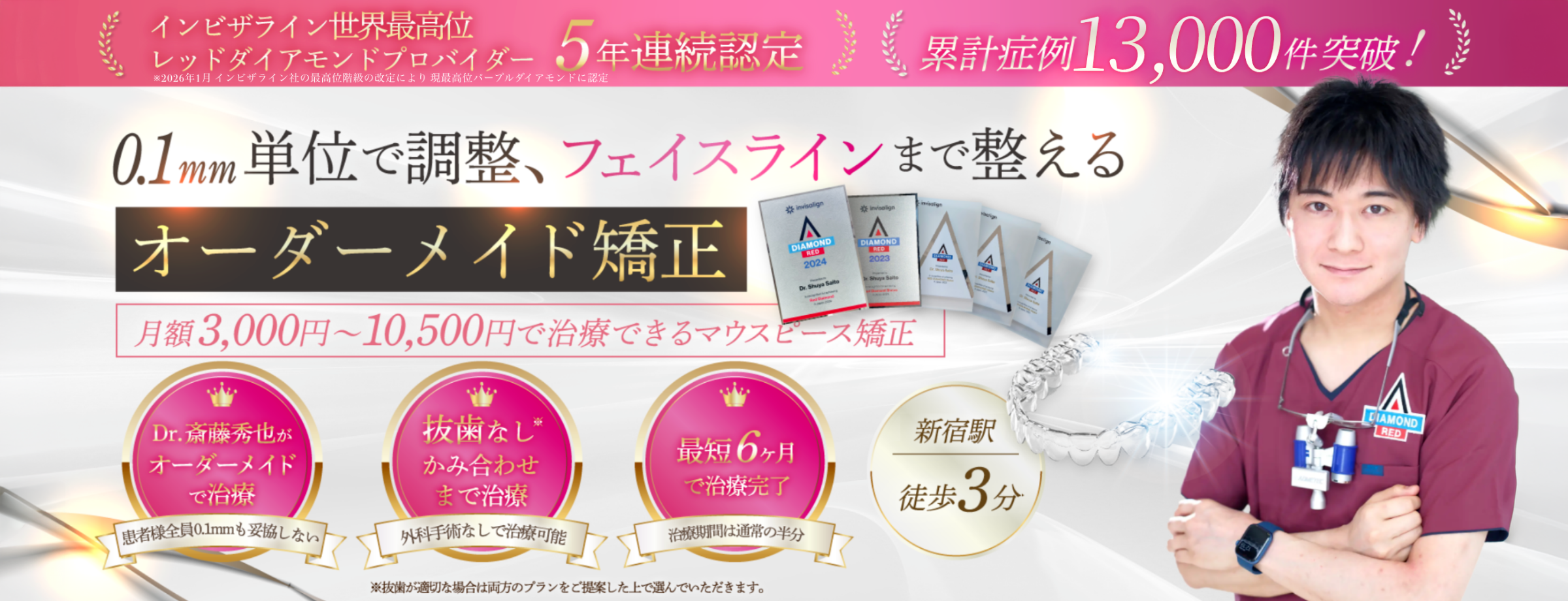 現時点において、新宿さいとう矯正歯科では、13,000名に対するマウスピース矯正の治療実績と国内でも多くの実績を有しています