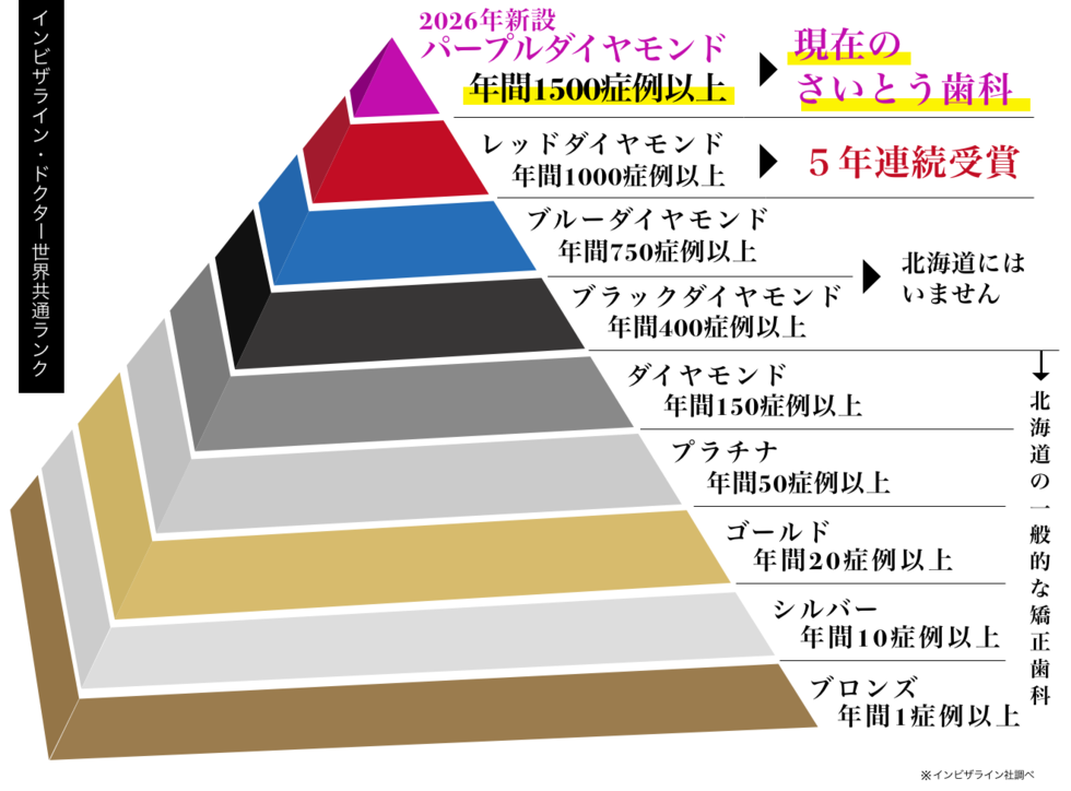 インビザラインには、年間の症例数に応じてプロバイダーの称号が与えられる制度があります。当院のDr.斎藤 秀也は、2019年から2022年の4年連続で北海道内の最多症例数を手がけました。その症例数は累計9,087件。10年連続でプロバイダー認定を受け、さらには5年連続で最高位のレッドダイヤモンドプロバイダーに選ばれています(インビザライン社調べ)。※2026年1月に最高位が更新されパープルダイヤモンドプロバイダーに選ばれています